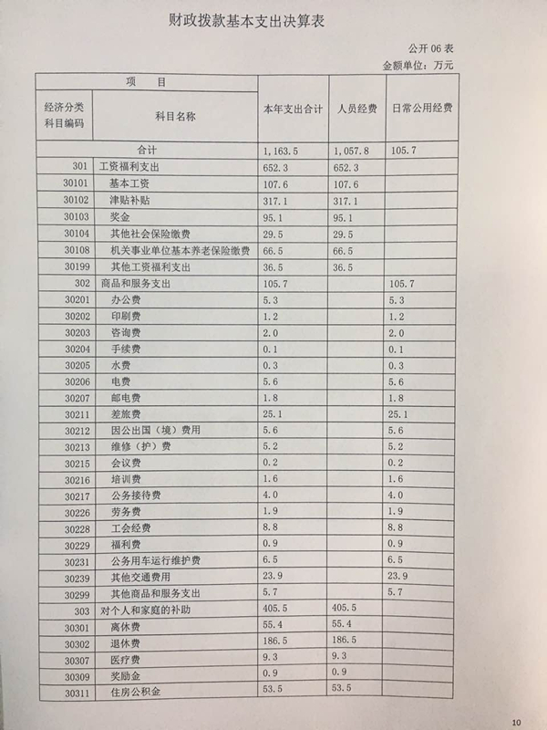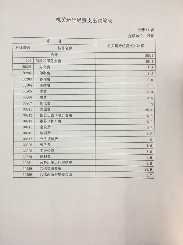 (二)公用经费105.7万元,主要包括:办公费、印刷费、咨询费、手续费、水费、电费、邮电费、差旅费、因公出国(境)费用、维修(护)费、会议费、培训费、公务接待费、劳务费、工会经费、福利费、公务用车运行维护费、其他交通费用、其他商品和服务支出。