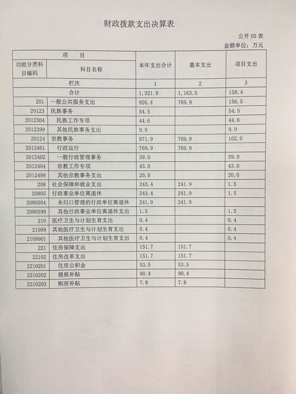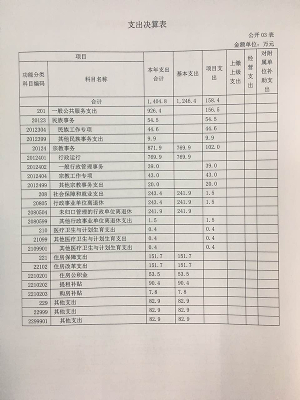 3.宗教事务(款)行政运行(项)。年初预算为559万元,支出决算为769.9万元,完成年初预算的137.73%。决算数大于预算数的主要原因是人员经费及机关运行经费支出增加。