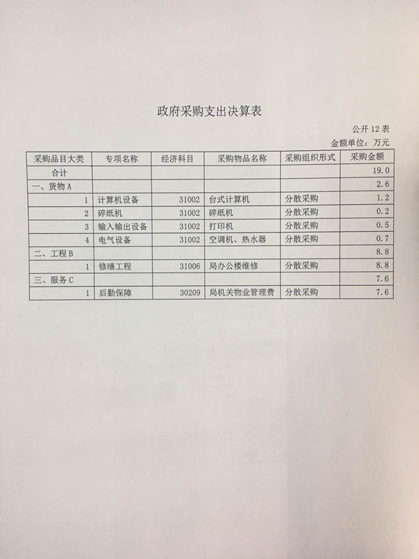 2016年度政府采购支出总额19万元,其中:政府采购货物支出2.6万元、政府采购工程支出8.8万元、政府采购服务支出7.6万元。