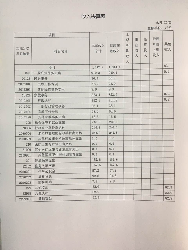 1.财政拨款收入1314.4万元,为当年从市级财政取得的一般公共预算拨款和政府性基金预算拨款,与上年相比增加223.6万元,增长20.5%。主要原因是人员经费及宗教工作专项经费有所增加。